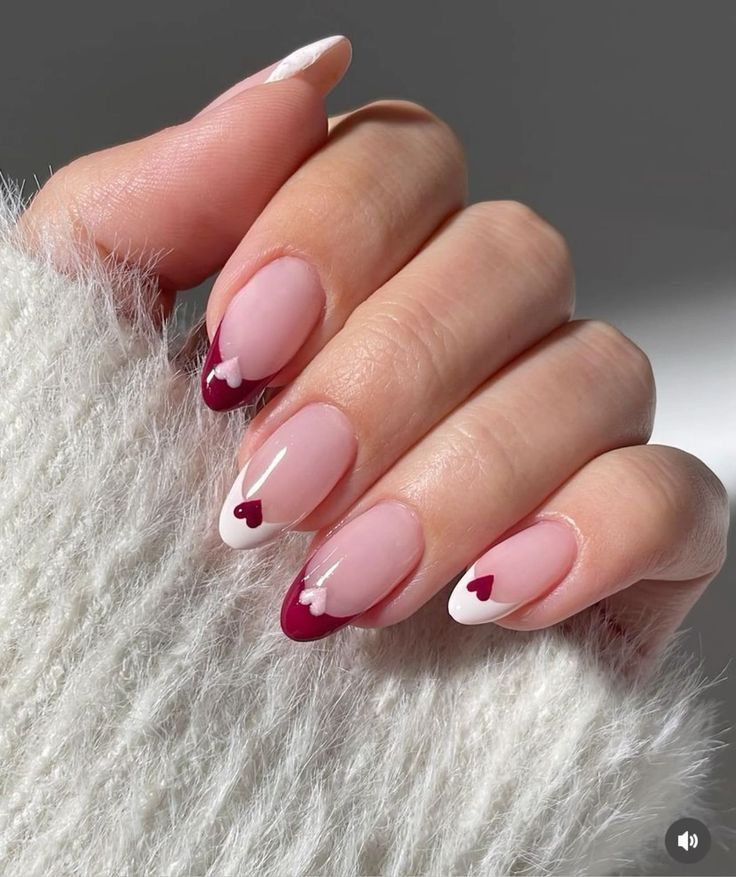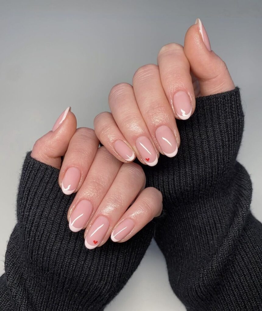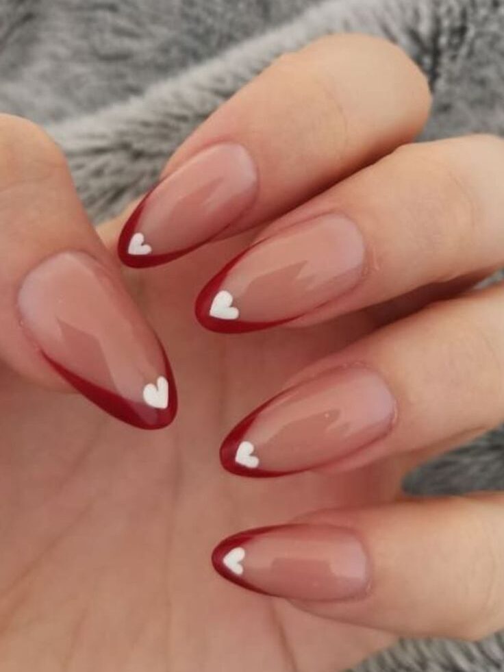 Instead of a classic French tip, you can do a red one with some small red hearts or you can do this design in white if you are a person who prefers neutral colors of the stark Valentine red.