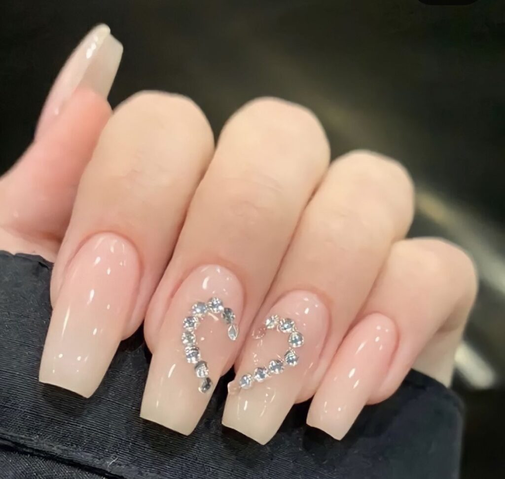 You can also layer a gentle layer of glitter on top of your classic ballerina pink nails and add another accent heart for a beautiful look on your nails.