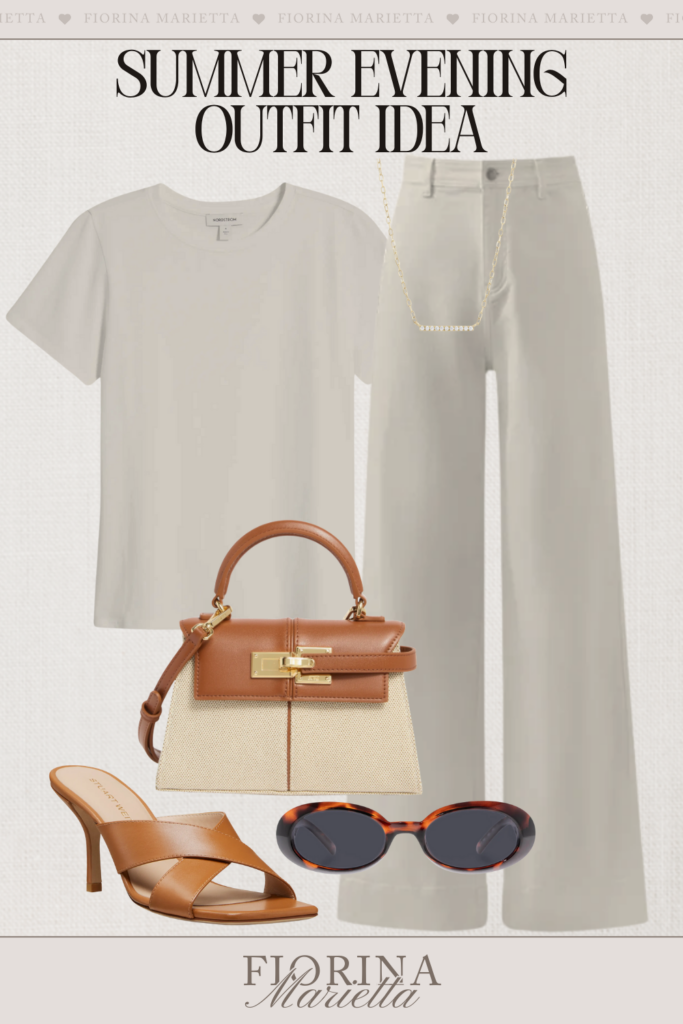 This outfit combination always works. Because the long pants will elongate your silhouette and create an effortlessly chic appearance every time. Monochromatic tones (matching the color of your T-shirt to the color of your pants). Will make the outfit feel polished and cohesive. And to finish off the look with sophistication. You can add classic accessories that are matched in colors. As well as a structured handbag and some heeled sandals.