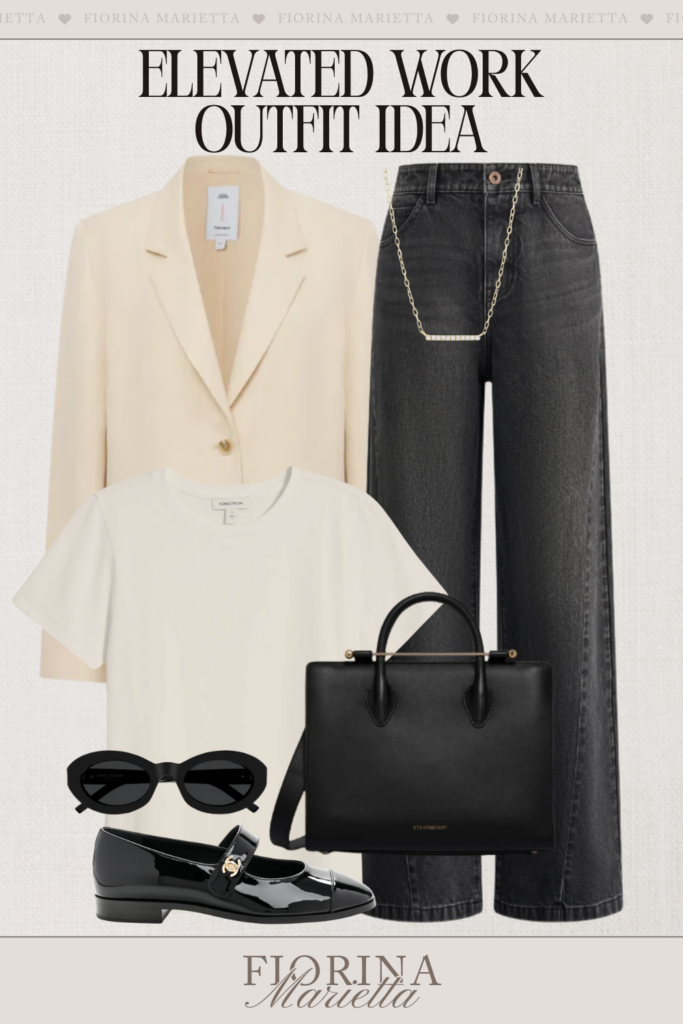 Black Jeans or tailored trousers keep the silhouette elegant and elongated. Finish with loafers or sleek flats for a polished but wearable work outfit. This is perfect for creative offices, meetings, or days when you want to feel confident but comfortable.