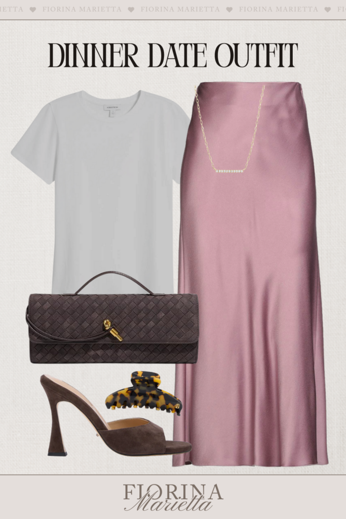 This is one of my favorite ways to dress up a white T-shirt. The contrast between a casual tee and a feminine satin skirt creates an effortless, chic balance that feels modern and elegant. It’s understated but still special — perfect for dinner dates or evening plans.