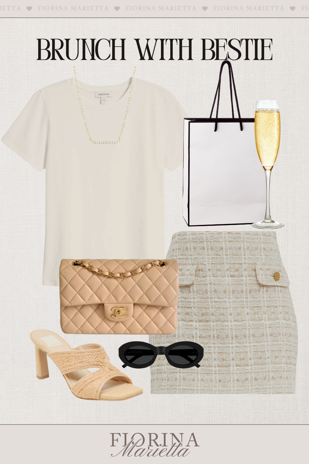 A structured mini skirt, such as tweed, will give you a high-end look. While being a piece, you can easily style it with a classic white shirt. This combination creates a super flattering silhouette. And you can easily elevate this look further by pairing it with heeled sandals and a classic handbag. Keeping the shirt tucked in the skirt will maintain the polished look. So don’t forget about that when styling this look.