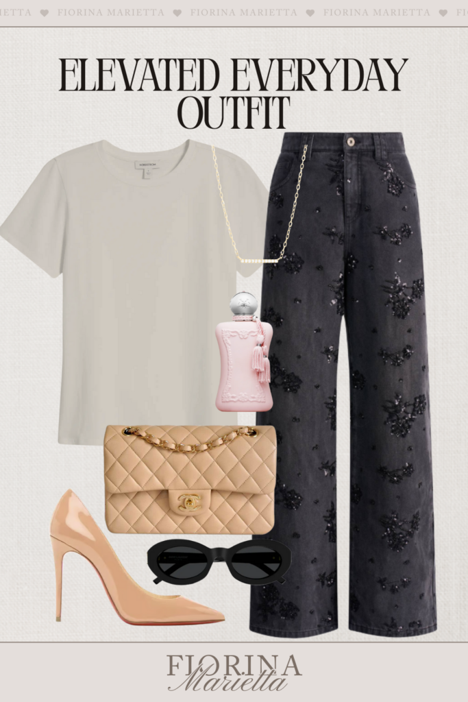 A pair of classic nude pumps can elevate a piece as simple as a white T-shirt. So if you don’t have a pair of nude pumps, you have to invest in one because they are super versatile and can be worn day and night. Black Jeans will look super elegant and sophisticated when paired with a white t-shirt and nude pumps. But my favorite are these black embellished jeans that look super chic and elevated.