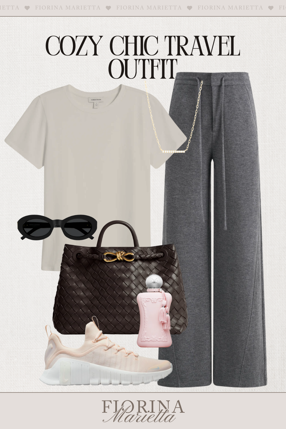 This is the perfect travel outfit when you want to be comfortable but still look chic. A white T-shirt keeps the look fresh, while soft knit pants add warmth and dimension. Relaxed trousers make this outfit ideal for long days on the go.