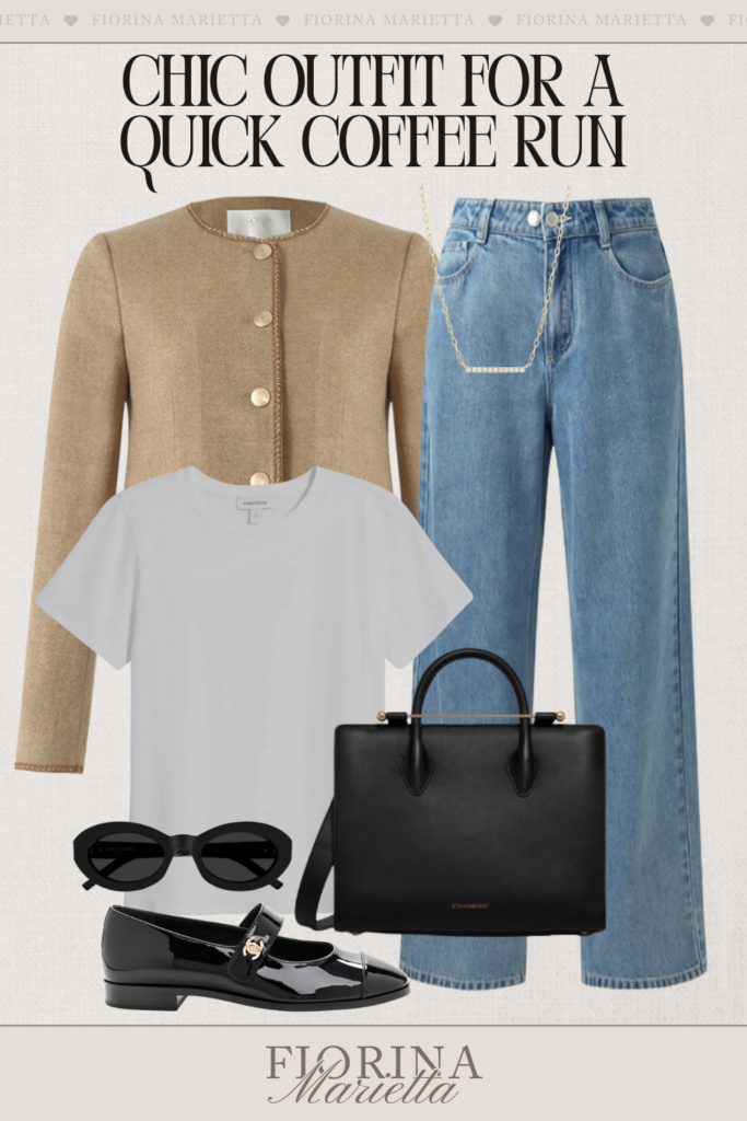 A trench coat is one of the easiest ways to elevate a white T-shirt outfit. It adds instant sophistication and makes even the most casual outfit feel intentional. This look is ideal for spring days when the weather is unpredictable — polished enough for lunch, casual enough for errands.