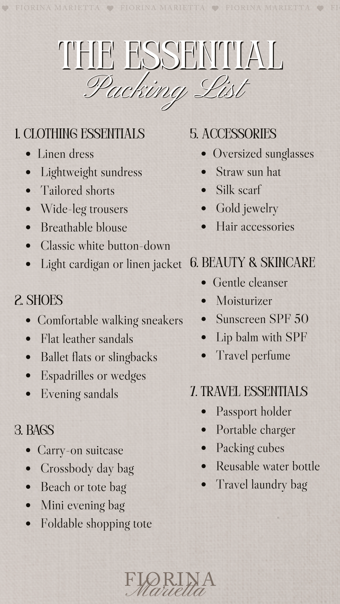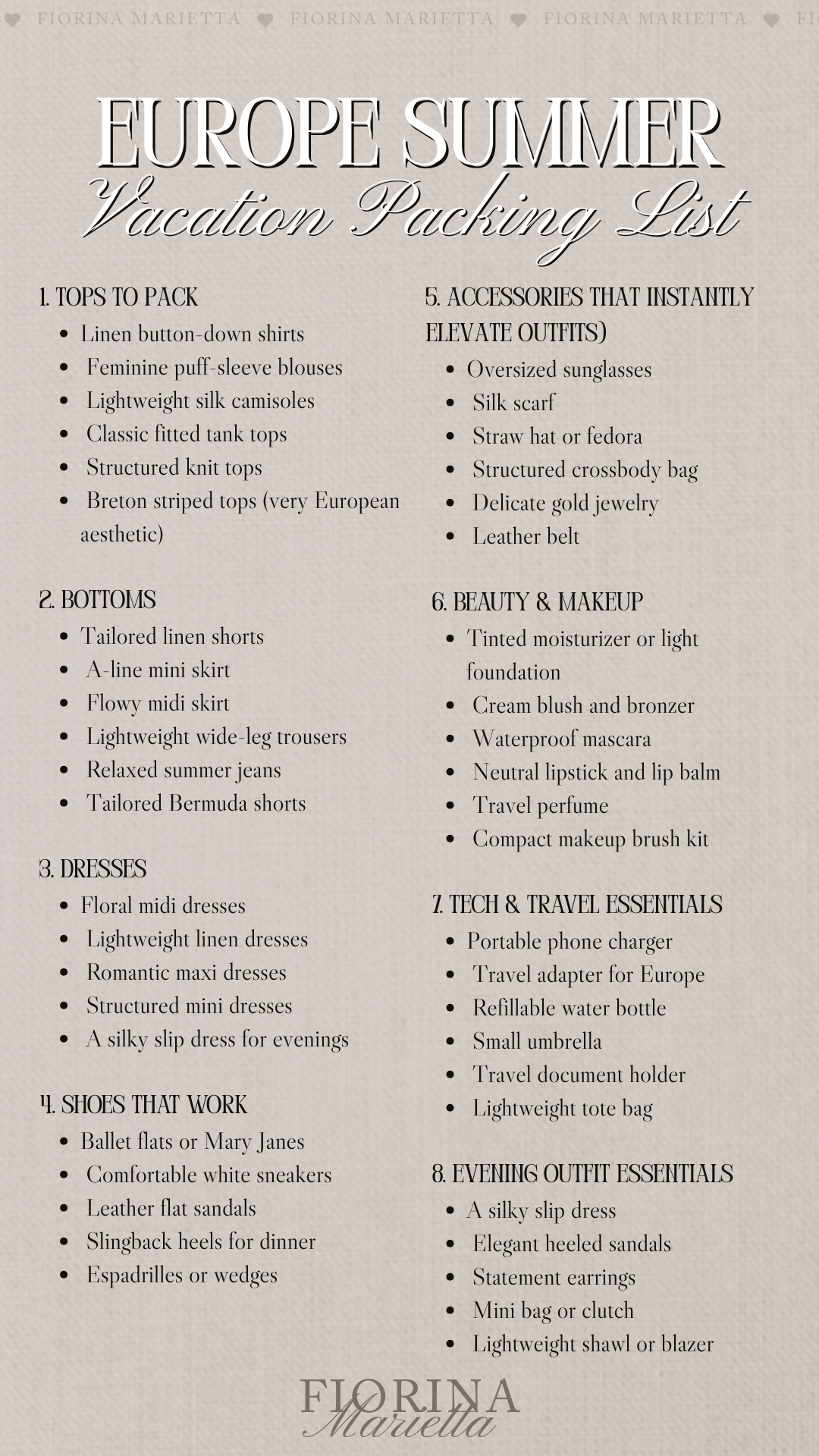 Your packing list should focus on mix-and-match pieces that transition easily between daytime sightseeing and evening dinners. Neutral colors and soft summer tones make it easy to create many outfits from fewer items while still looking chic in photos and throughout your trip.