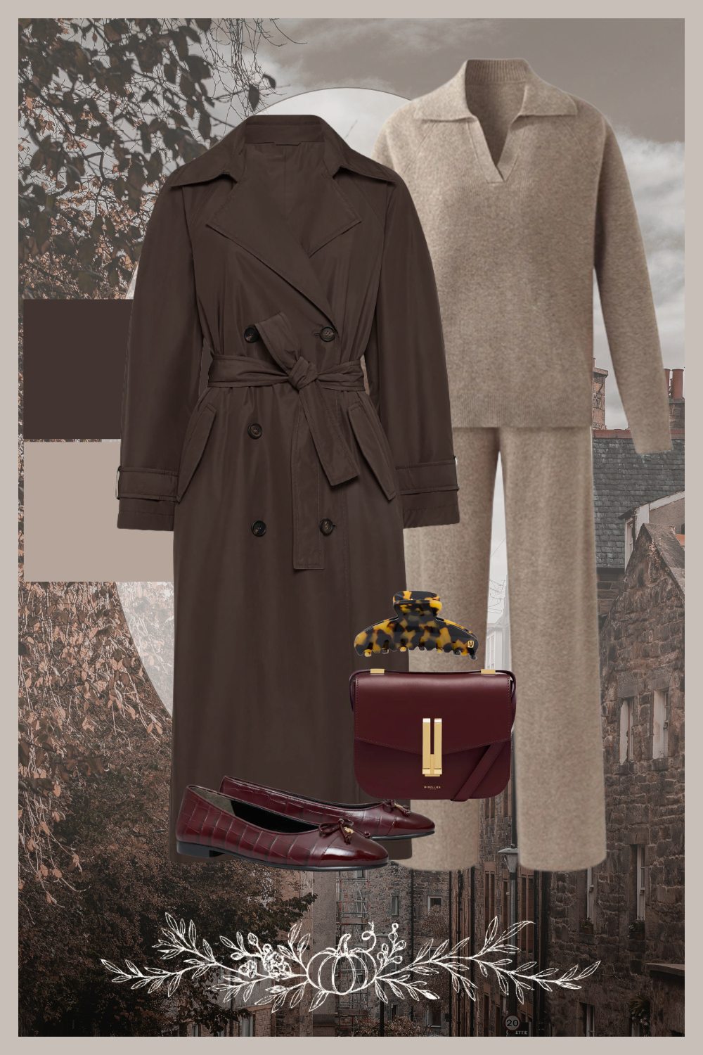 Chocolate Trench Coat \ Oatmeal Knit Set \ Burgundy Flats \ Burgundy Crossbody Bag \ Tortoise Hair Clip