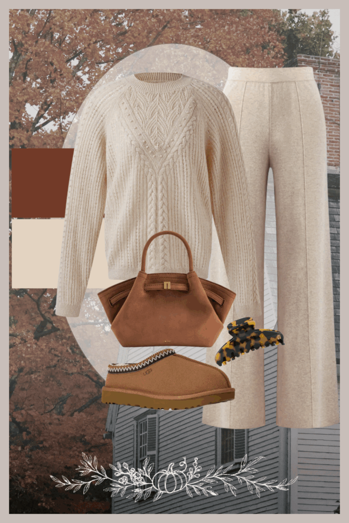 Cable Knit Sweater \ Ivory Knit Pants \ Brown Suede Tote \ Tan UGG Slippers \ Tortoise Hair Clip
