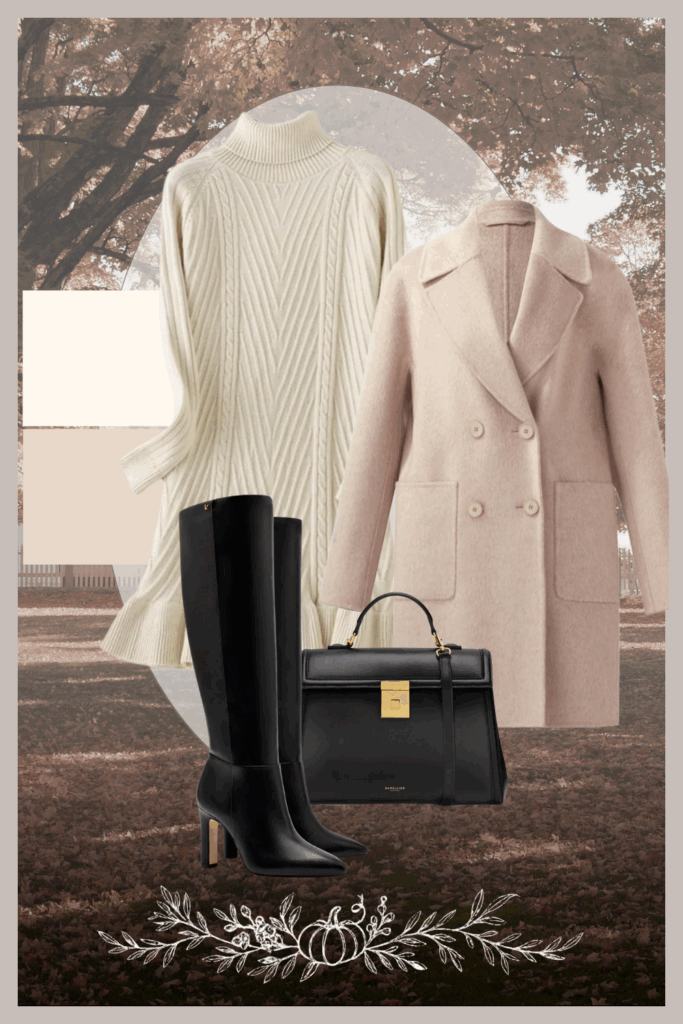 Ivory Knit Dress \ Wool Coat \ Structured Black Handbag