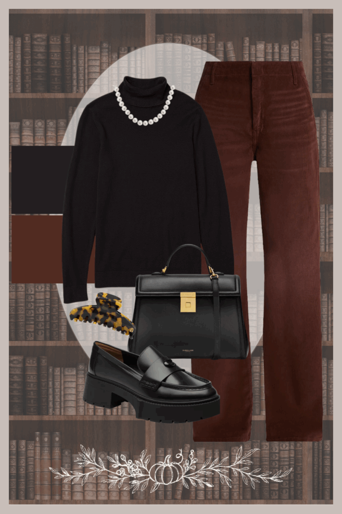 Black Turtleneck Sweater \ Corduroy Pants \ Black Bag \ Black Loafers \Tortoise Hair Clip \ Pearl Necklace
