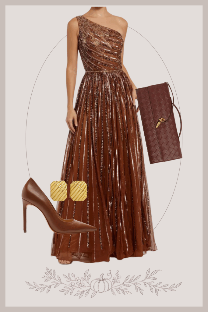 One-Shoulder Sequin Gown \ Brown Heels \ Earrings \ Burgundy Clutch