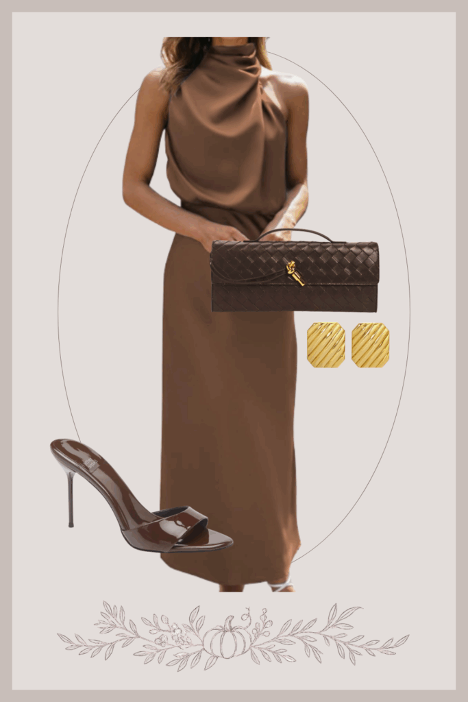Brown Satin Dress \ Brown Mules \ Gold Earrings \ Leather Clutch