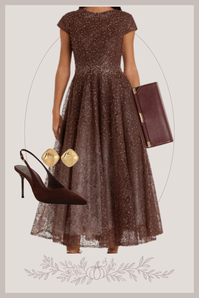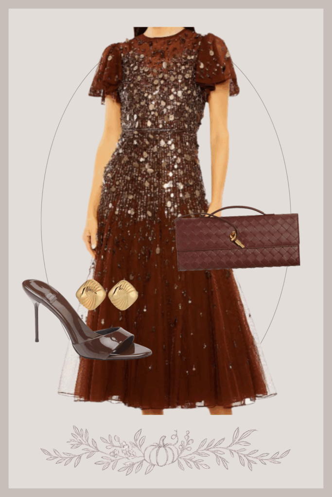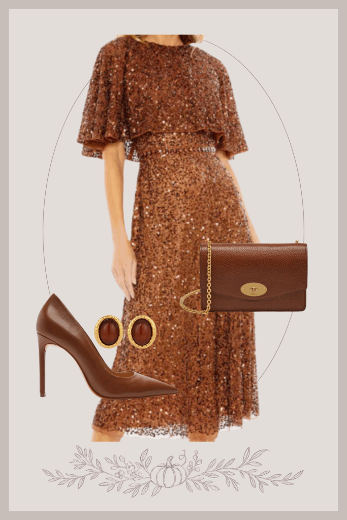 Copper Sequin Midi Dress \ Brown Pointed-Toe Pumps \ Gold Earrings \ Leather Bag