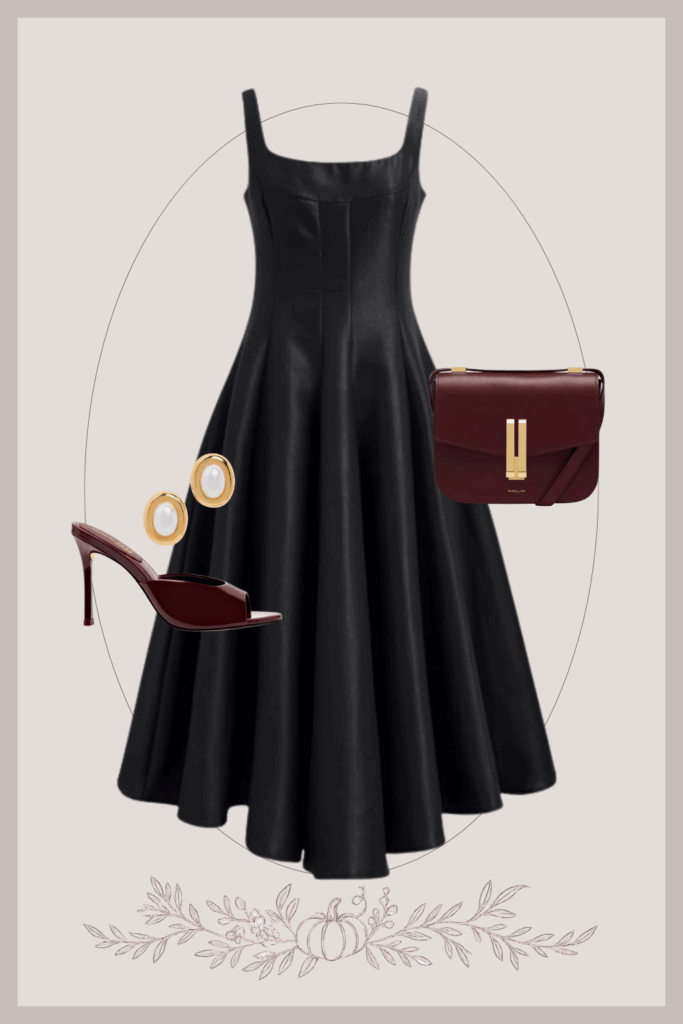 Black Satin Dress \ Burgundy Heels \ Burgundy Bag \ Vintage Gold Earrings