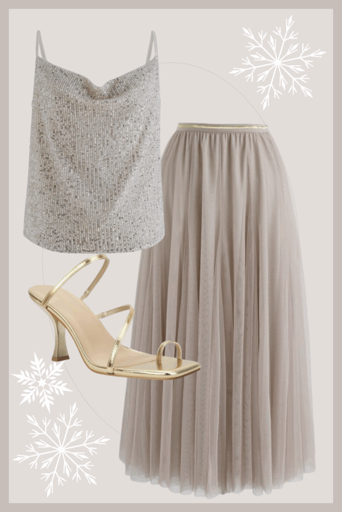 For something soft and whimsical, try an ivory tulle skirt with a champagne or silver shimmer blouse. It’s playful yet elevated, making it a great option for festive dinners or elegant holiday parties. Add heels or sparkly flats and you’re ready to go.