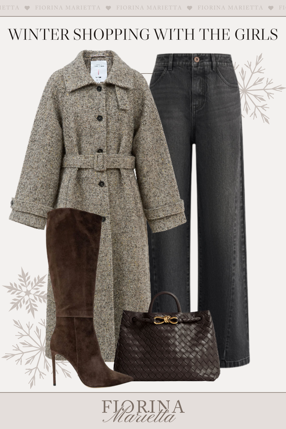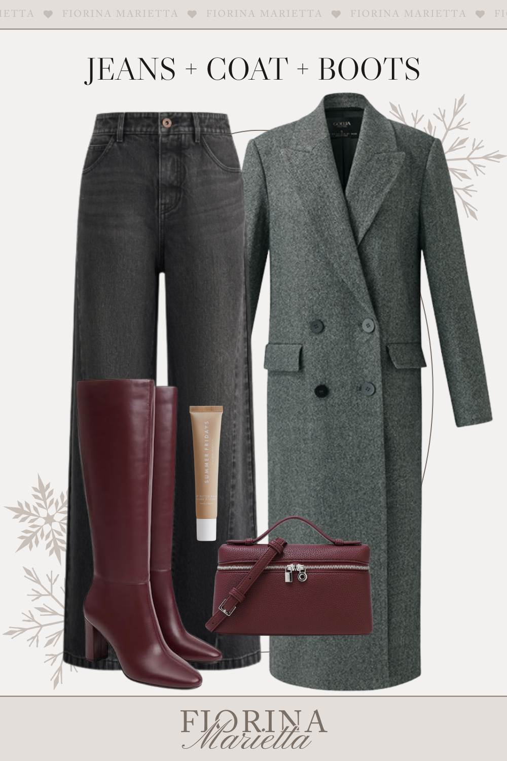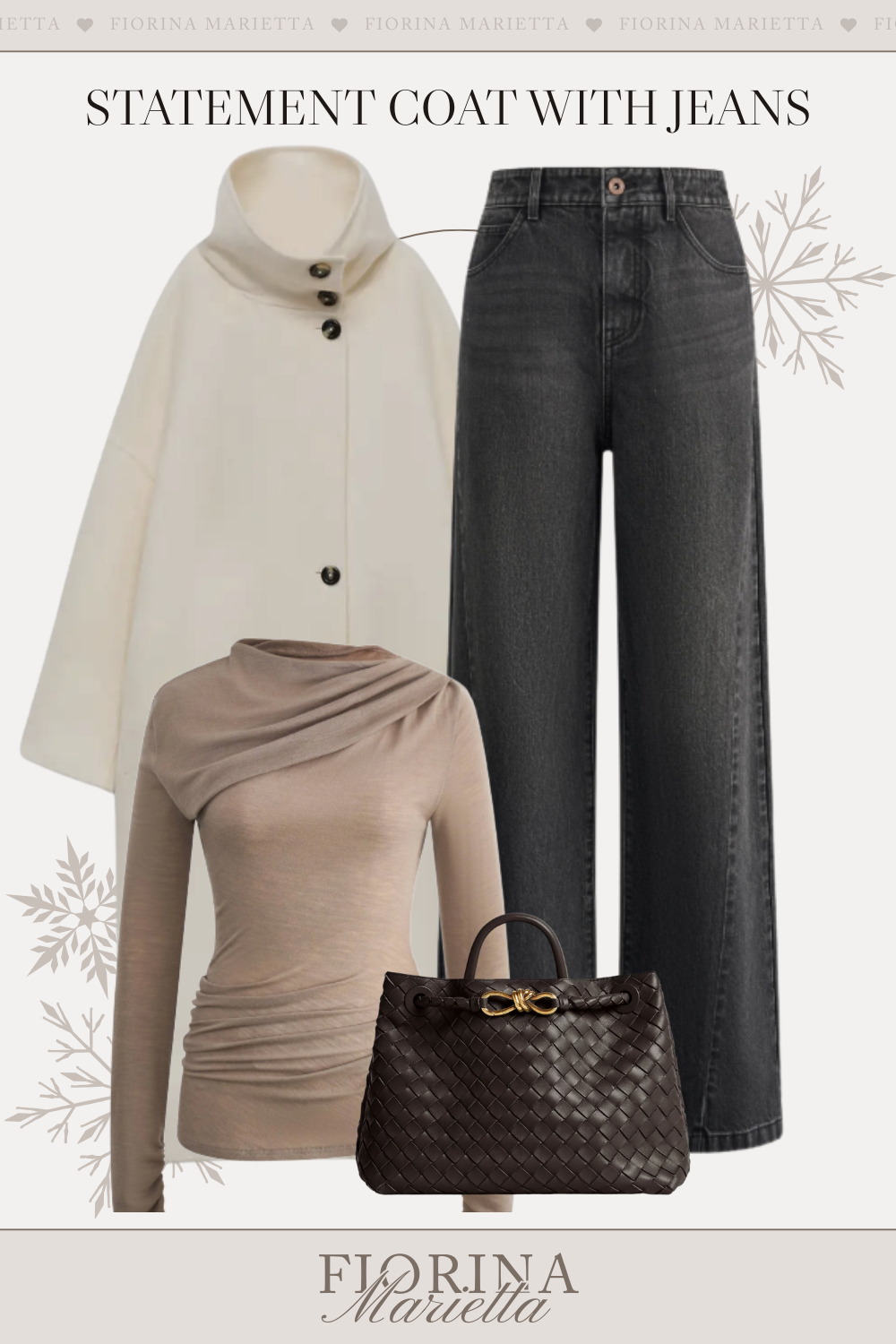 Pair your favorite straight-leg jeans with a long wool or belted wrap coat in a rich neutral tone — think camel, charcoal, or deep navy. Add heeled boots and a structured bag for that “quiet luxury” look.