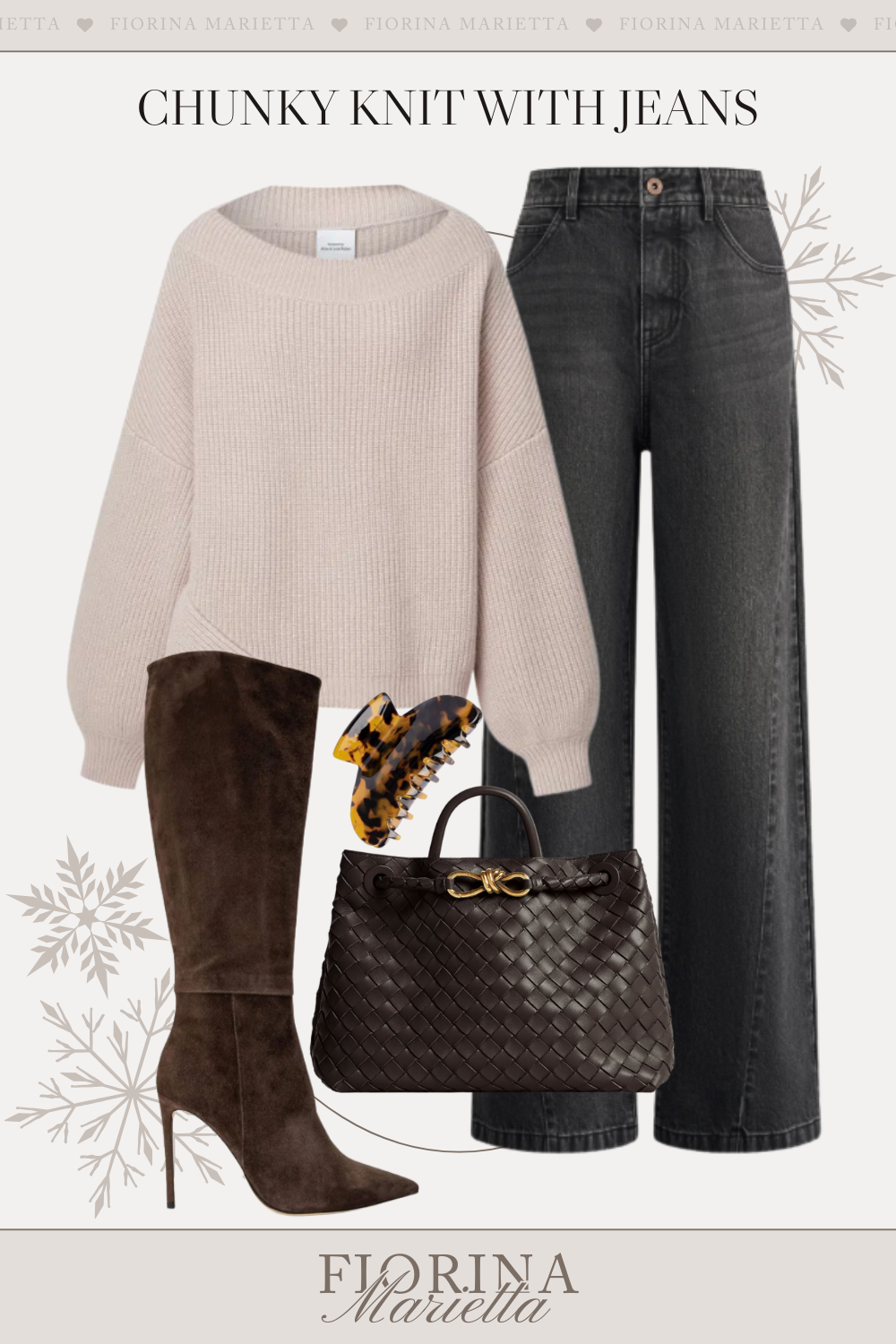 You can’t go wrong with the classic jeans + knit combo. Choose a thick, textured sweater (like cable-knit or ribbed styles) in winter whites, soft greys, or earthy tones. Tuck in the front slightly to define your waist, and finish with ankle boots or loafers.