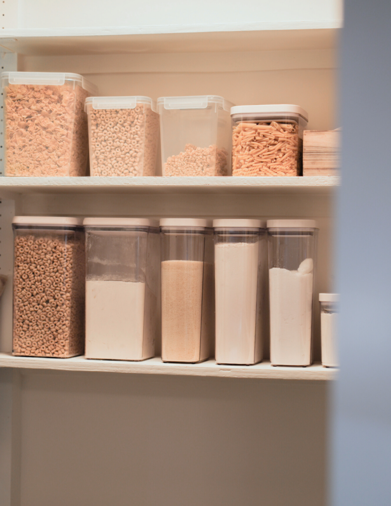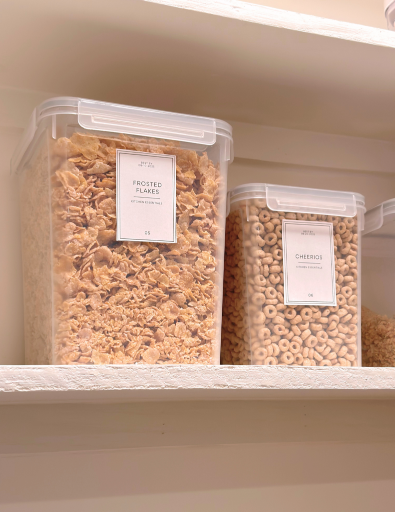 • Organize the pantry by categories (breakfast, snacks, baking, dinner)